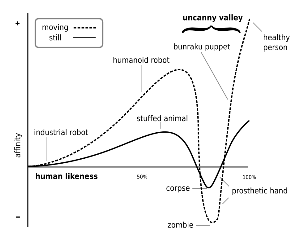 Artificial intelligence researchers have long recognized the potential for machines to approximate certain human characteristics and capacities and for humans to feel ambivalent about such developments. In 1949, Alan Turing developed his famous imitation game, in which an independent evaluator attempts to discern which participant in a conversation is human and which a machine based on a transcript of their natural-language conversation, as a measure of the proximity of the intelligence of the machine to that of a human. Douglas Hofstadter described the Eliza effect, which derives from interactants ascription of understanding and intelligence to a rudimentary psychotherapy chatbot developed by Joseph Weizenbaum in 1966, as “the susceptibility of people to read far more understanding than is warranted into strings of symbols—especially words—strung together by computers.” In 1970, Japanese roboticist Masahiro Mori hypothesized an “uncanny valley” of human affective response to machines that trends positive as the machine more closely resembles a human until it gets too close and ends up eliciting revulsion as long as the human can still tell the difference.
